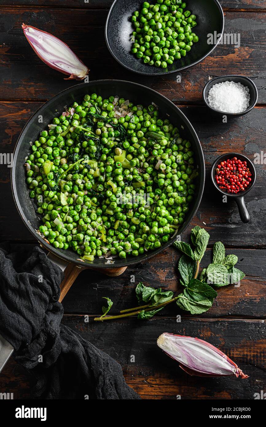 Recette De Pois Molles Anglais Dans Une Poele Et De Petits Pois Dans Bol Avec Poivre D Echalote A La Menthe Et Dessus De Sel Vue De Dessus Sur La Vieille Surface En